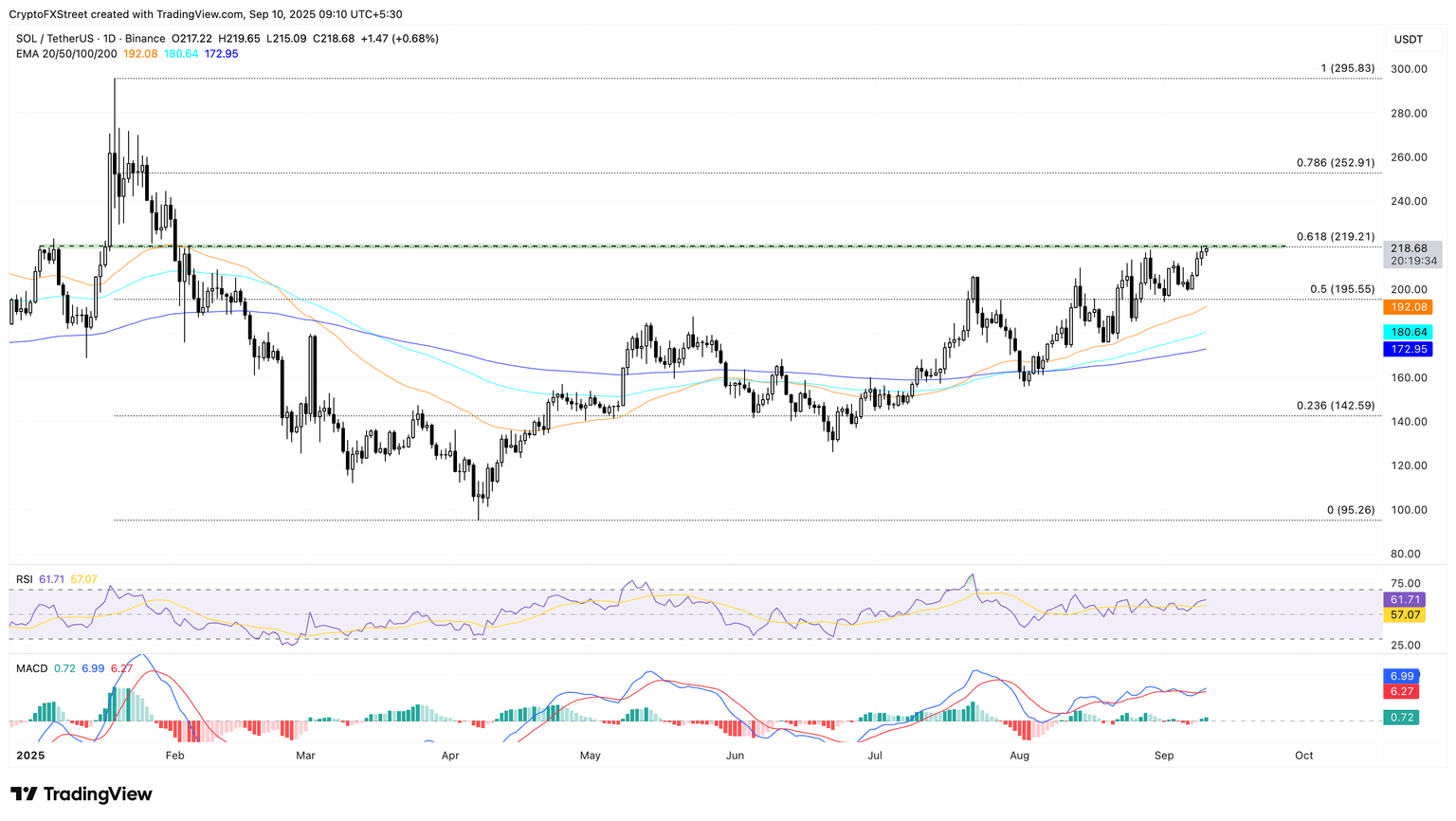 Solana faces opposition at the 61.8% Fibonacci level at $219, which is retraced from the $295 high from January 19 to the $95 low from April 7. If SOL surpasses this crucial resistance, it would confirm a breakout rally, potentially targeting the 78.6% Fibonacci level at $252.