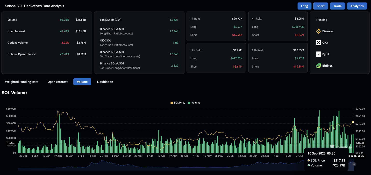 CoinGlass data shows that the Solana OI has increased by over 8% in the last 24 hours, reaching $14.68 billion. Supporting the optimism, trading volume holds steady at $25.19 billion.