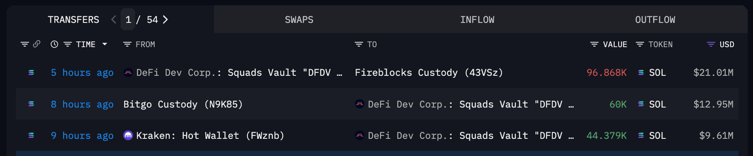 Arkham Intelligence data shows that DeFi Development Corp (DFDV), a NASDAQ-listed Solana treasury company, acquired 104,379 SOL (over $22 million) on Tuesday in two on-chain transactions via Bitgo for 60,000 SOL and Kraken for 40,379 SOL.
