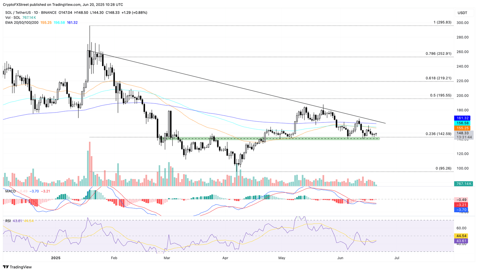 Solana ticks higher by under 1% at press time on Friday as it prepares a potential early reversal from the $140 demand zone, which aligns with the 23.6% Fibonacci retracement level at $142, drawn from the all-time high of $295 to the year-to-date low of $95.