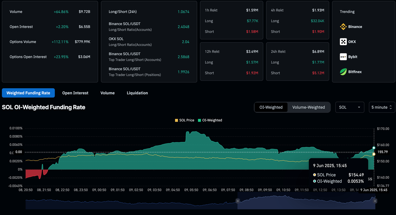 As Solana reclaims the $150 psychological level, the gradual recovery fuels the optimism in the derivatives market. The SOL Open Interest has increased by 2.20% in 24 hours, reaching $6.55 billion, and reflecting a rise in capital flow in Solana derivatives.