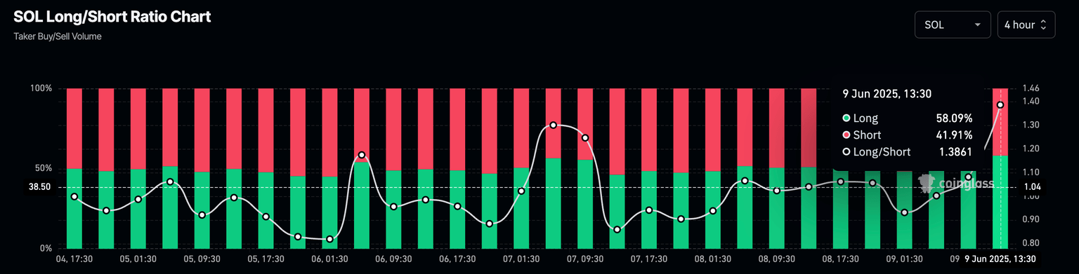 Finally, the SOL Long/Short Ratio, which uses the taker buy/sell volume, indicates a ratio of 1.3861 over the past 4 hours, cementing the bullish dominance. The indicator reflects 58.09% of the volume in the past 4 hours coming from long positions, signaling a rising bullish inclination among derivative traders.