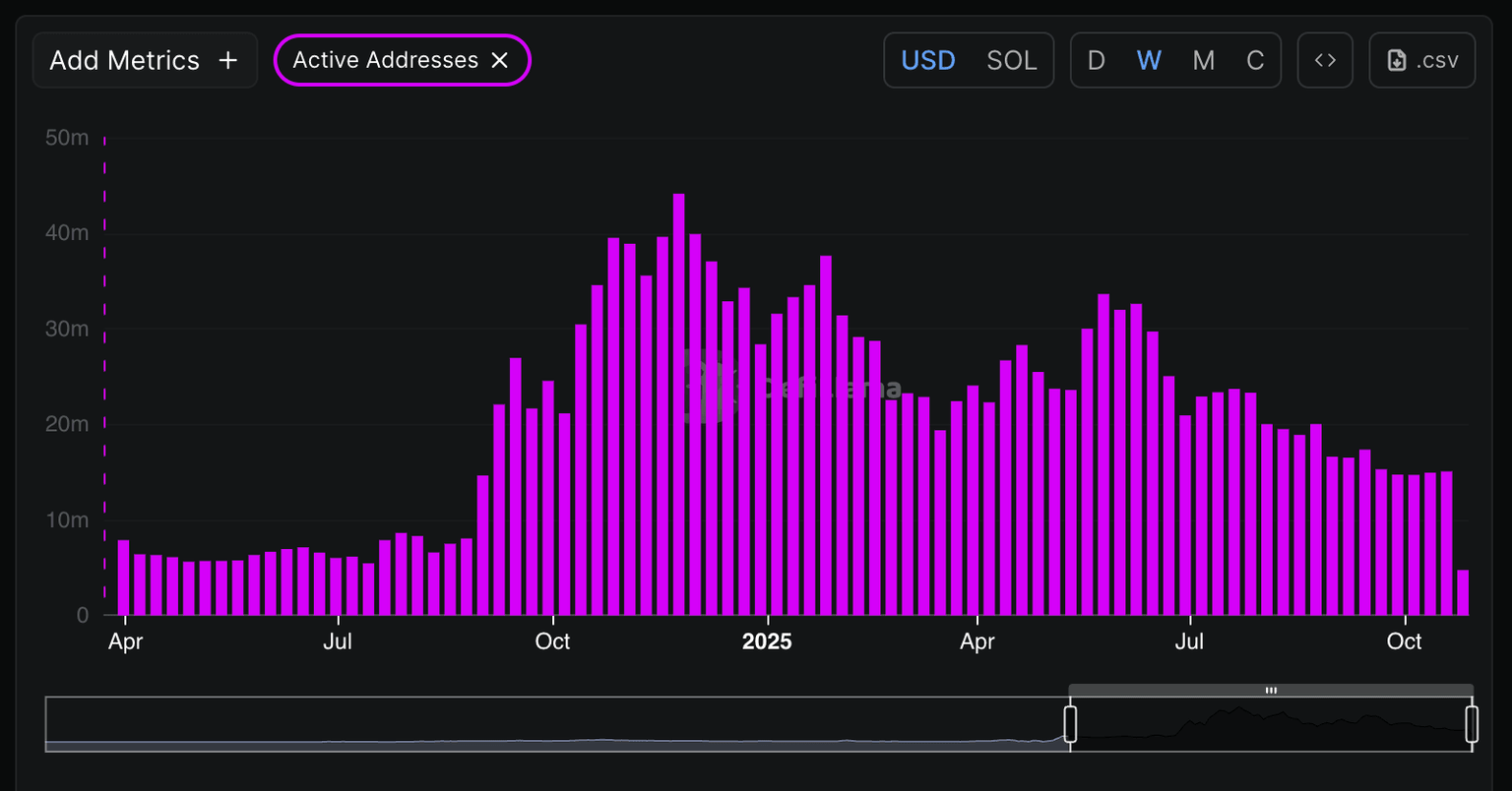 - Active Solana addresses drop by over half to 15 million per week from 33.63 million.