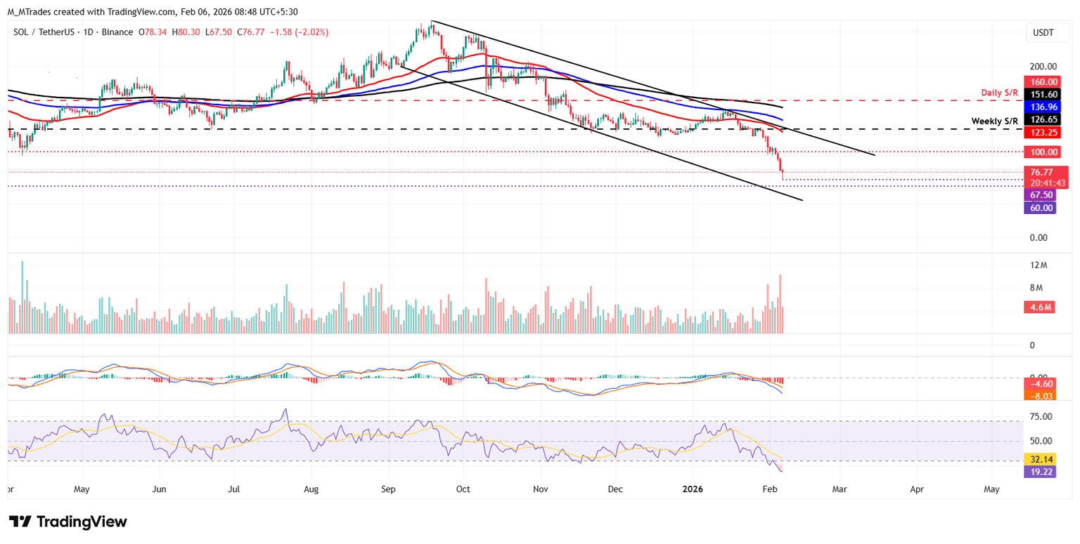 Solana price was rejected at the weekly resistance at $126.65 on January 28 and declined by over 21% through Tuesday, closing below the $100 key psychological level. After losing this key level, the sell-off intensified, reaching a low of $67.50 as of Friday.