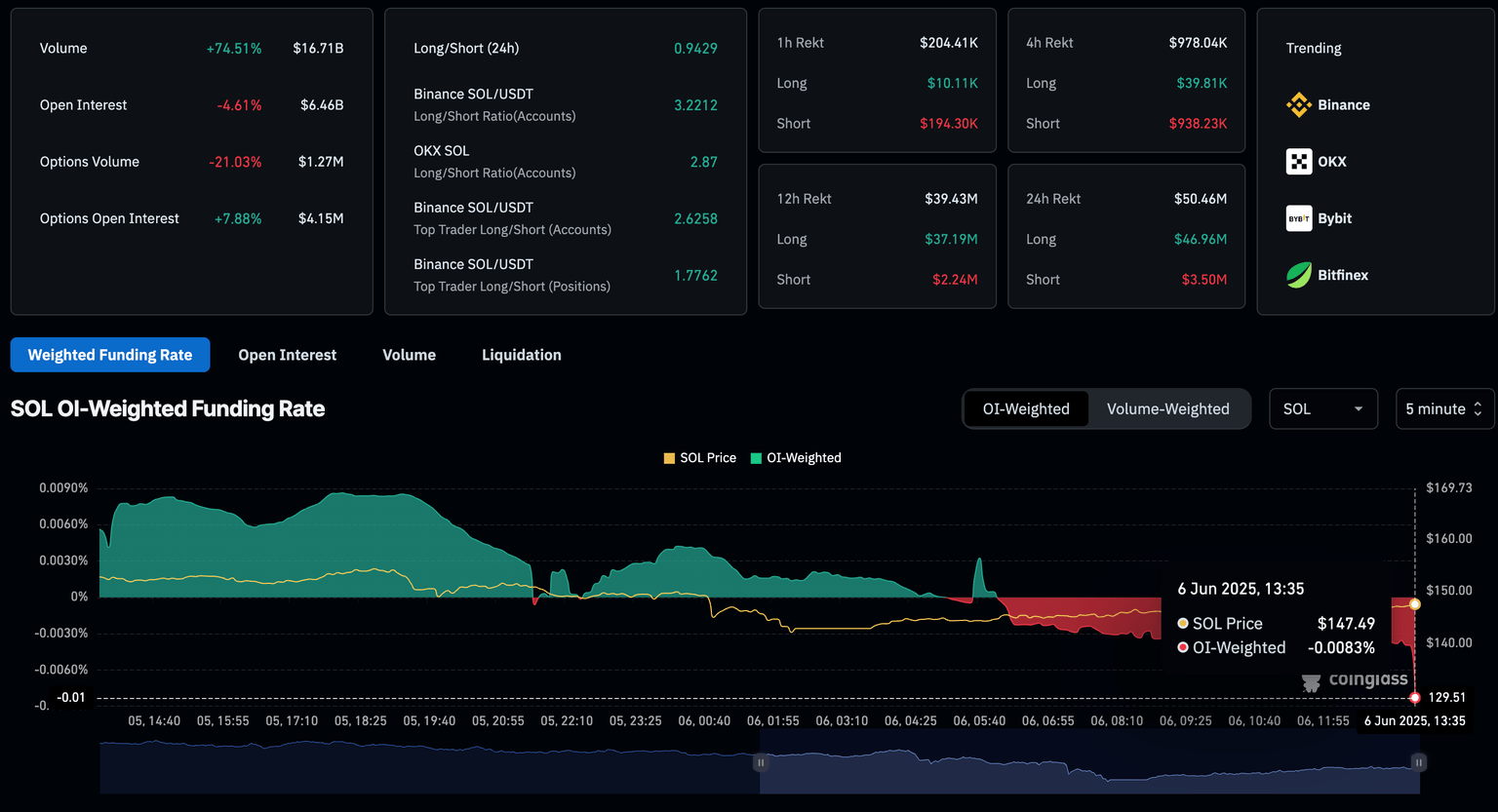According to Coinglass, the Solana Open Interest (OI) has dipped by 4.61% in the last 24 hours to $6.46 billion. A perpetual contract’s OI relates to the number of open positions in either futures or options, and its decline translates to a decrease in traders' interest in participating in such agreements.