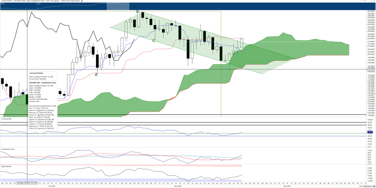 It is essential that Solana price close above the November 21st open of $217, or the hidden bearish divergence may push Solana back into the bull flag and likely even lower to test the bottom of the Cloud (Senkou Span B) at $184.