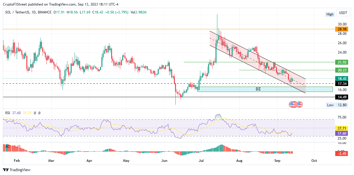 Solana price remains confined within a descending parallel channel, facing immediate resistance from the governing pattern’s midline at around $18.42. Unless bulls get their act together, SOL could extend south, breaking below the immediate support at $17.34 before dipping into the demand zone (DZ) around the psychological $16.00 range. Such a move would denote a 12% decline from current levels.