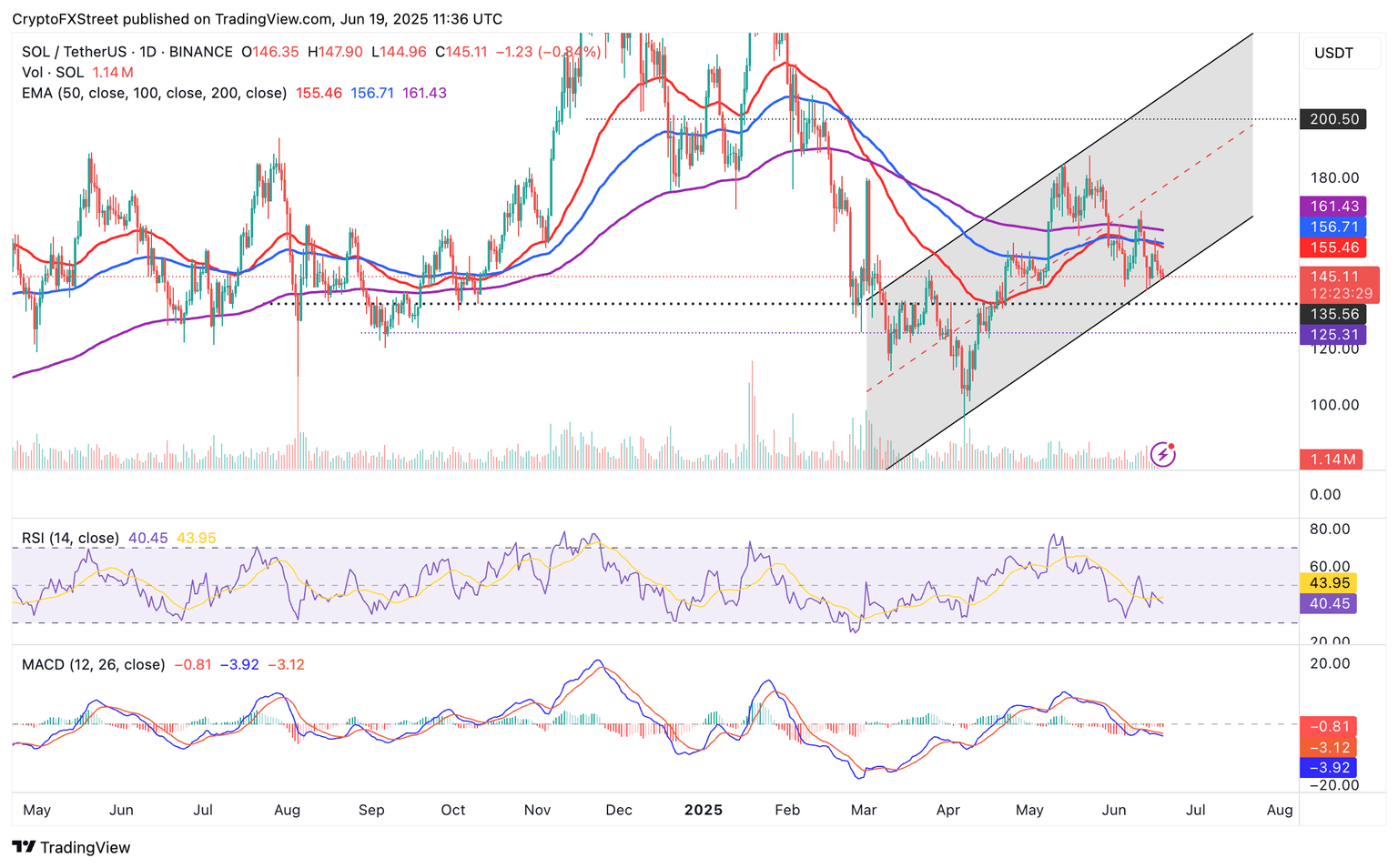 - Solana's downtrend extends, testing ascending channel support at around $145.