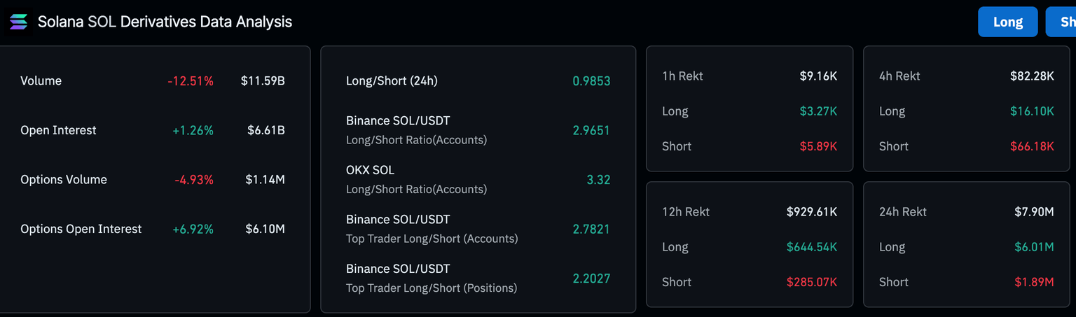 - Solana derivative's long-to-short ratio leans bearish as liquidations reach $8 million over the last 24 hours.