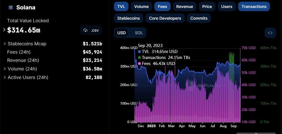 Data from DeFiLlama shows a steady increase in transaction fees on the Solana network between November 2022 and September 2023, moving from $23,680 to the current $46,430. This represents a 96% rise in ten months.