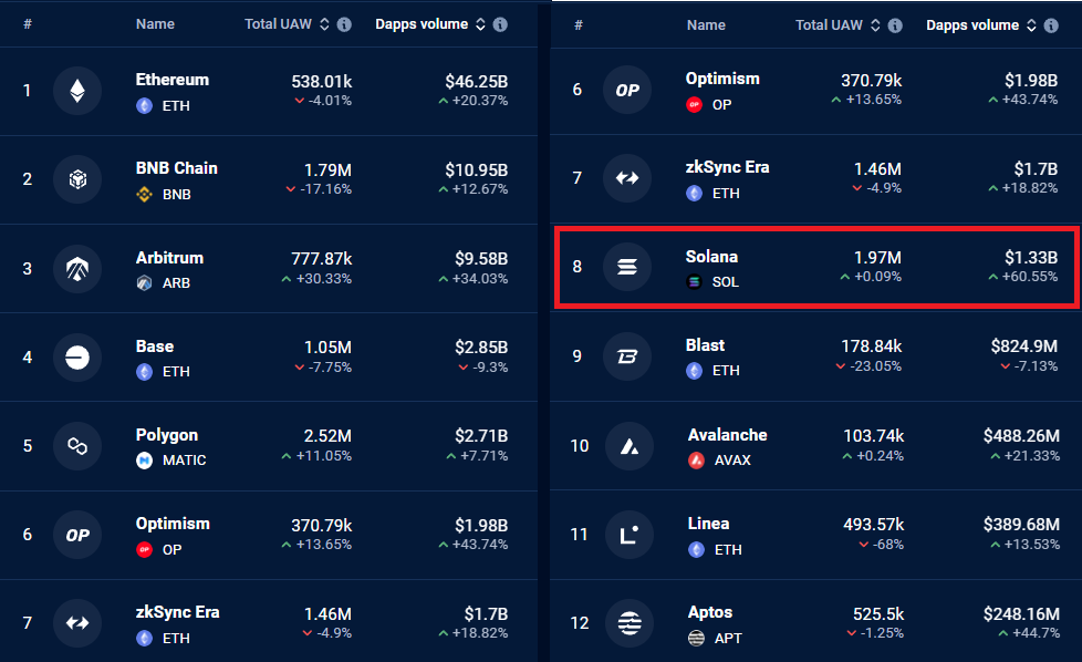Recent data from DappRadar shows a significant uptick in Solana’s DApp volumes, which soared by 60% to $1.3 billion over the past week, outstripping its competitors. During the same period, Ethereum saw a 20% increase in activity, while BNB Chain experienced a 13% rise. Despite these gains, Solana’s active user count remained stable at around 2 million, even as the Ethereum network witnessed a 4% drop in active addresses.