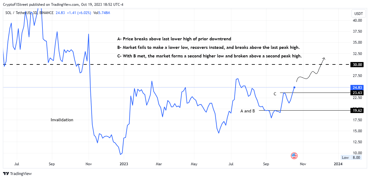 Solana price has also failed to make a lower low. Instead, it has recovered, holding above the last peak high of $19.62 as mentioned above. Lastly, with the second criteria in place, SOL has formed a second higher low at around $21.30, and broken above a second peak high at around $23.58.