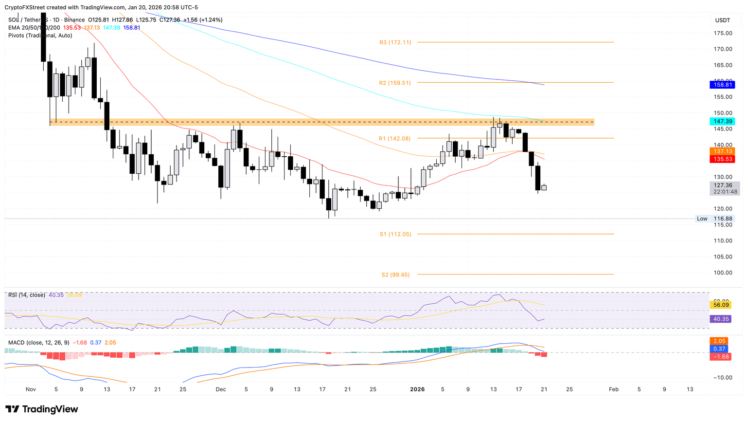 Solana trades below $130 at press time on Wednesday, down roughly 7% so far this week amid rising geopolitical tensions driven by US President Donald Trump's tariff threats. The 20-day Exponential Moving Average (EMA) at $135 reverses from the 50-day EMA, signaling renewed short-term selling.
