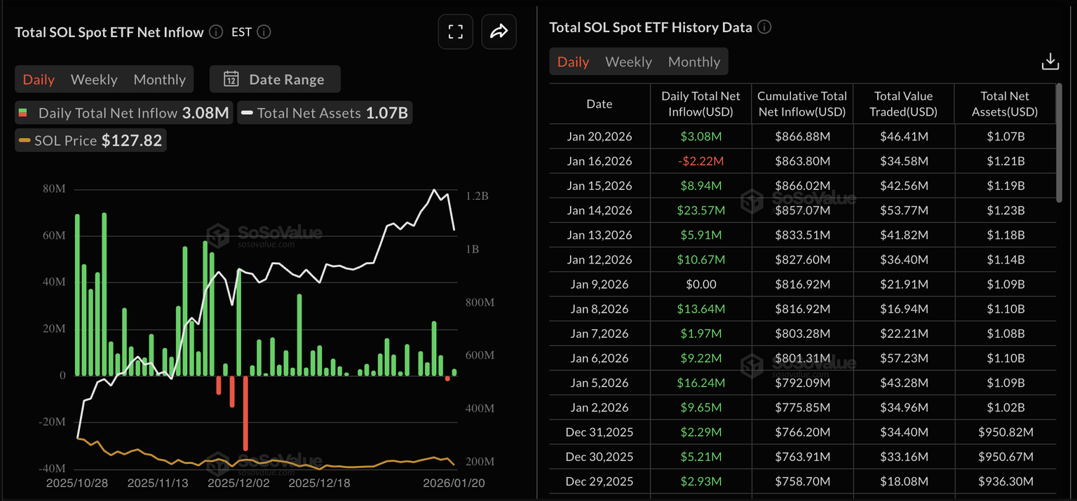 The US spot SOL Exchange Traded Funds (ETFs) on Tuesday recorded $3.80 million in inflows, recovering from $2.22 million in outflows from Friday. This inflow signals steady institutional interest in Solana amid declining crypto and global financial markets.