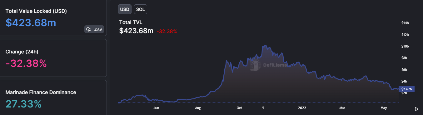 According to DefiLlama, at the time of writing, Solana’s TVL has fallen to $423.68 million, down 32.4% in the last 24 hours, a far cry from its all-time-high (ATH) of $10.17 billion on Nov. 9, 2021.