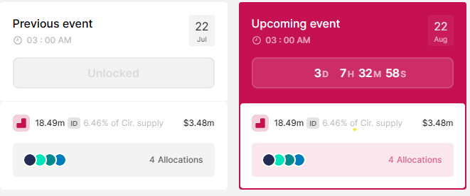 The upcoming Space ID token unlocks event is the most likely reason for renewed investor interest in ID tokens. On August 22, the network will unleash 18.49 million ID tokens to its circulating supply, worth approximately $3.4m.