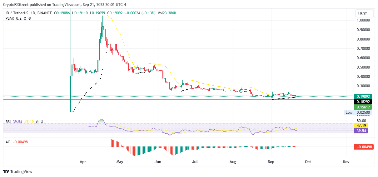 Space ID (ID) price is down 5% in the last 24 hours, succumbing to selling pressure as token holders close their positions to avoid being caught as part of exit liquidity. The price is currently testing the support provided by the Parabolic SAR, though thinly, at $0.1829.