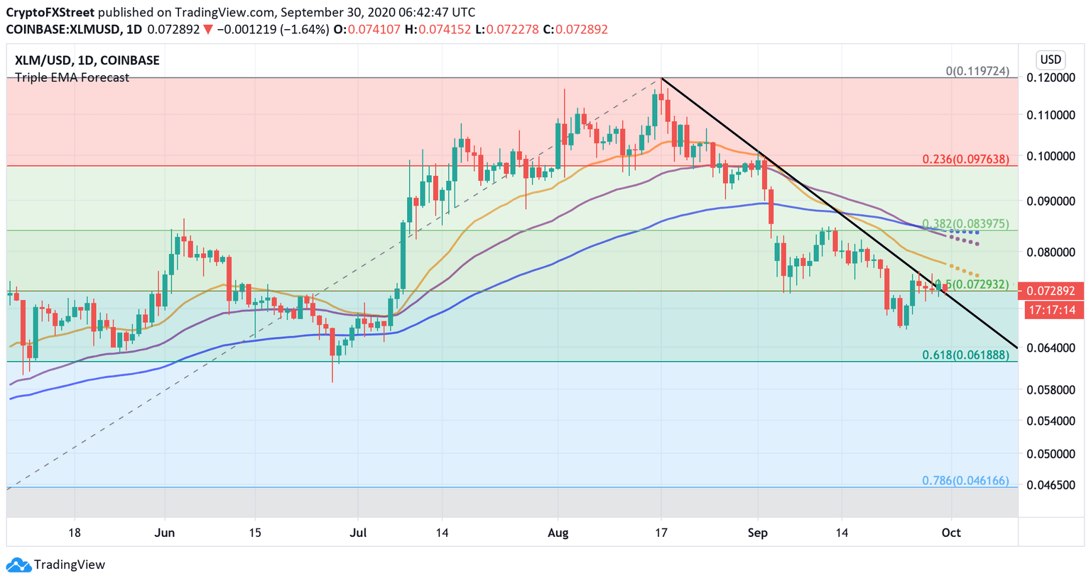 On the other hand, if XLM/USD settles above the downside trendline from the August 17 high, the bulls will get a chance to take the price to $0.08. However, resistance is reinforced by a combination of daily EMAs and 38.2% Fib, making it a hard nut to crack.