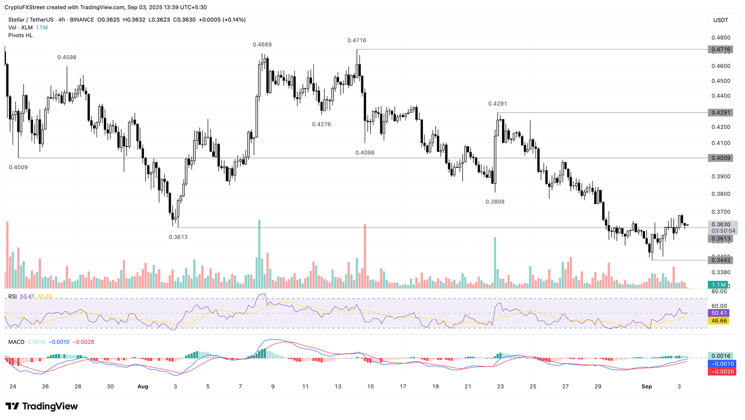 XLM corrects lower to $0.3630 on Wednesday, holding above the $0.3613 support level marked by a pivot low on August 3. The recent rebound from the $0.3442 low on Monday marks a fresh recovery after three consecutive weeks of losses.