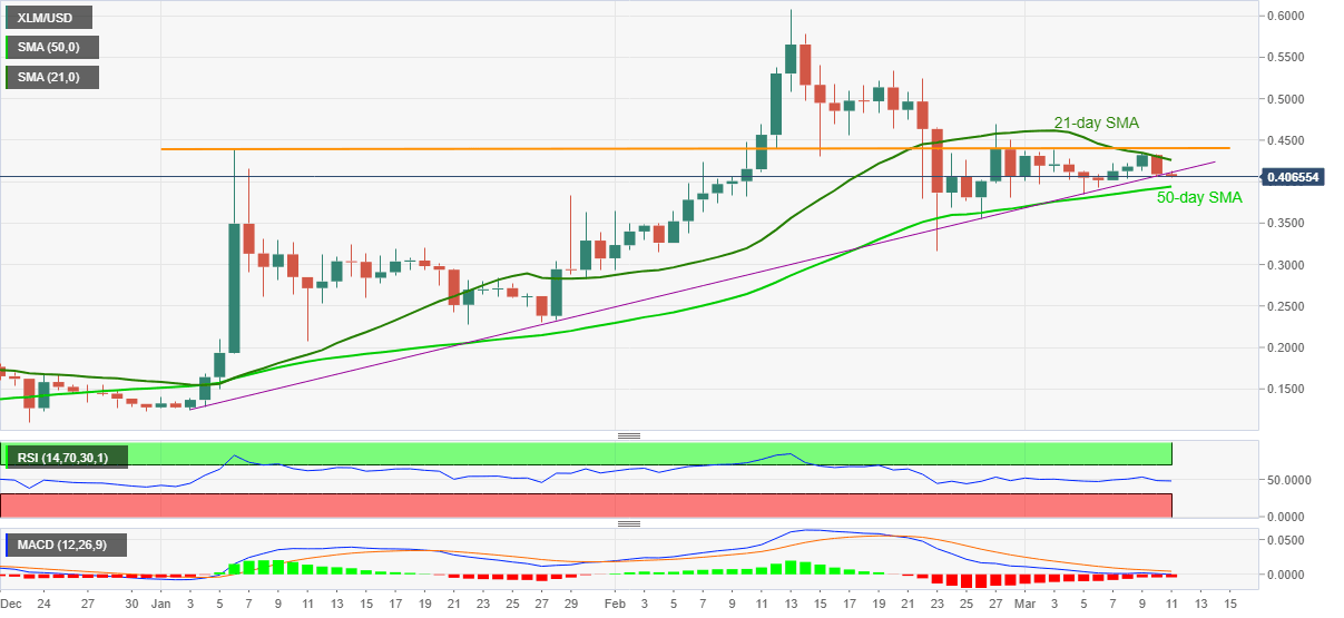 Stellar Lumens (XLM/USD) stays depressed around $0.4070, down 0.50% intraday, during the initial trading on Thursday. In doing so, the cryptocurrency pair extends the previous day’s pullback, also breaking an ascending trend line from early January, amid easing RSI.