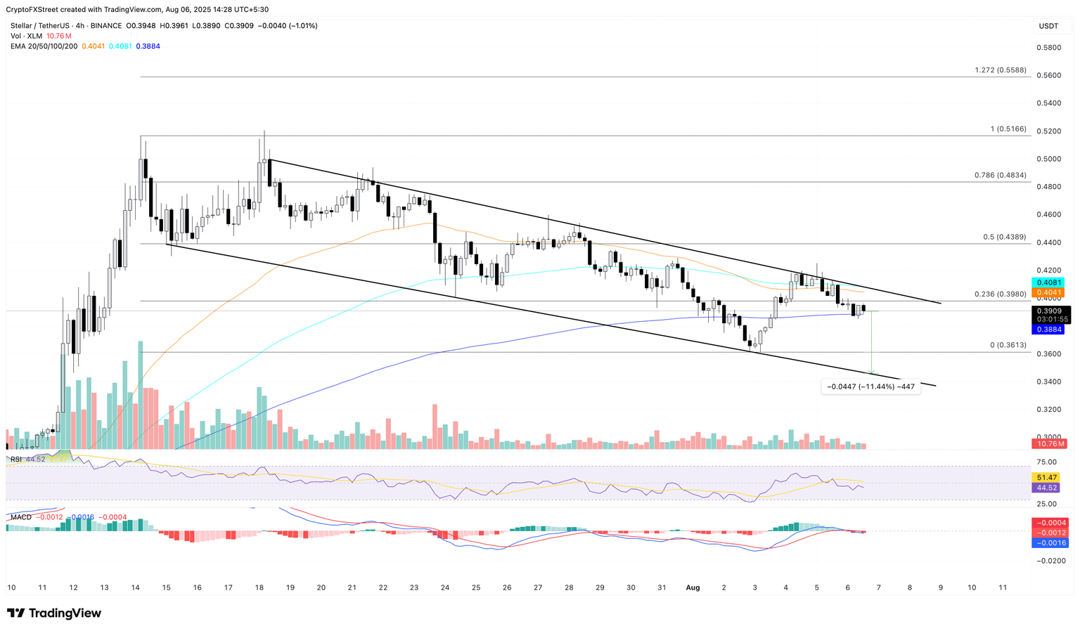 Stellar tests the 200-period Exponential Moving Average (EMA) at $0.3884 on the 4-hour chart, extending the 4.30% drop from the previous day. The declining trend steps below the 23.6% Fibonacci level at $0.3980, drawn from the $0.5166 peak on July 14 to the 0.3613 low on Sunday.