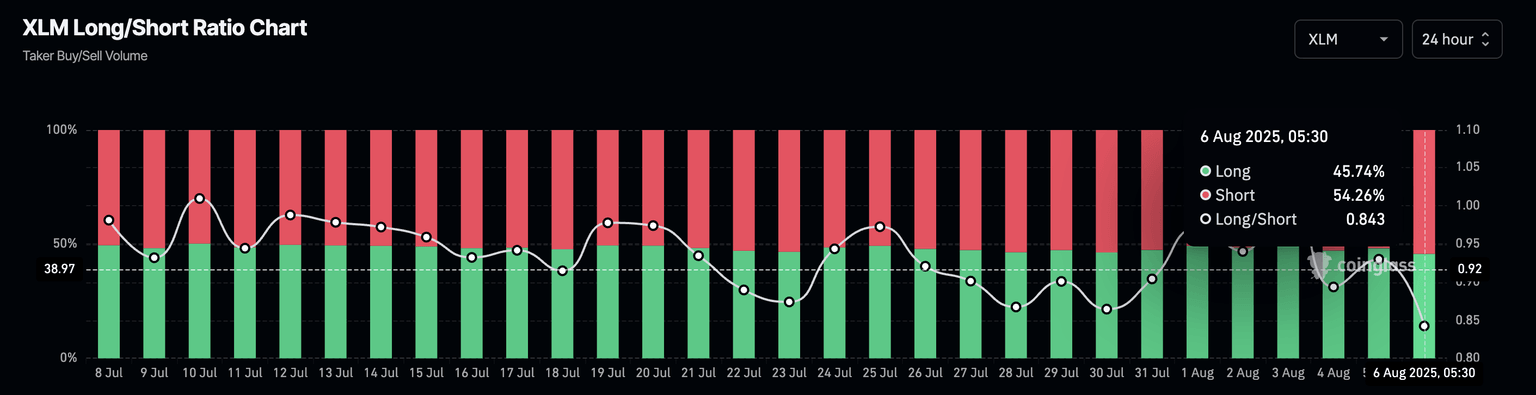 Traders with a higher risk appetite are betting against the XLM recovery chances by holding bearish positions. According to the XLM long-to-short ratio chart, short positions have increased to 54.26% from 51.81% on Tuesday.