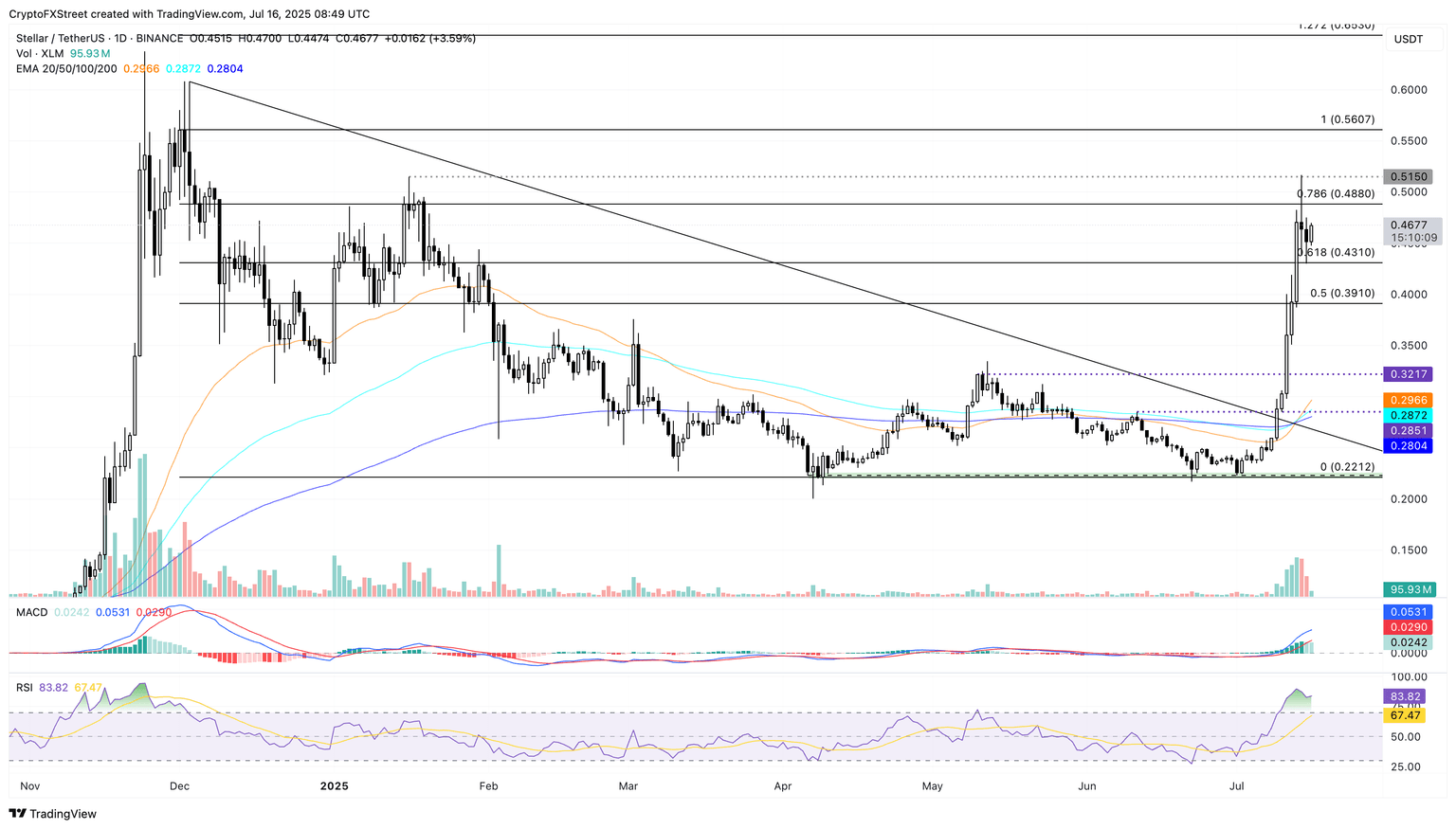 On the contrary, a daily close below the 61.8% Fibonacci retracement level at $0.4310 could extend the XLM declining trend to $0.3910, aligning with the 50% Fibonacci level.