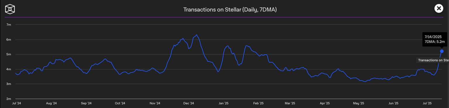 Stellar dominates the transaction count, with 5.20 million transactions (7-day moving average) as on Monday, significantly more than the 1.92 million on the XRP Ledger. An increase in transaction count is a direct result of heightened user activity.
