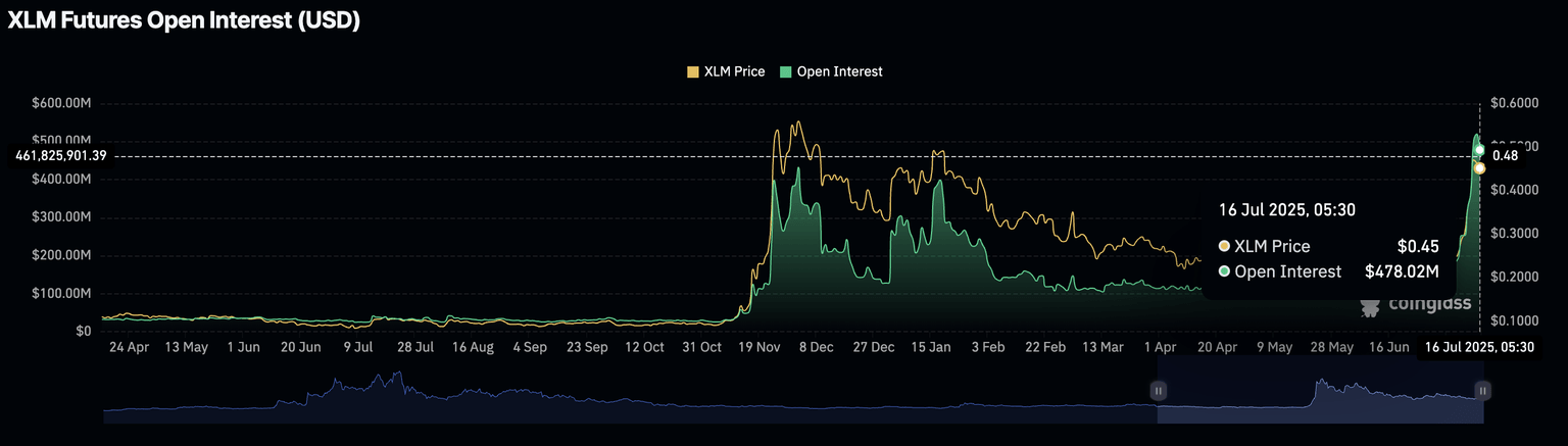 CoinGlass data shows that XLM Open Interest (OI) has dropped to $479.02 million, after reaching a record high of $520.03 million on Tuesday. The OI holds at record levels, suggesting increased capital inflows in XLM derivatives, a sign of heightened optimism.
