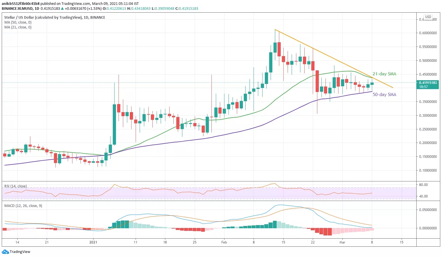 XLM/USD takes the bids around $0.4190 as crypto traders clean their screens for Tuesday’s move. Even so, the Stellar Lumens (XLM/USD) stays below the strong hurdle to the north comprising 21-day SMA and a falling trend line from February 13.