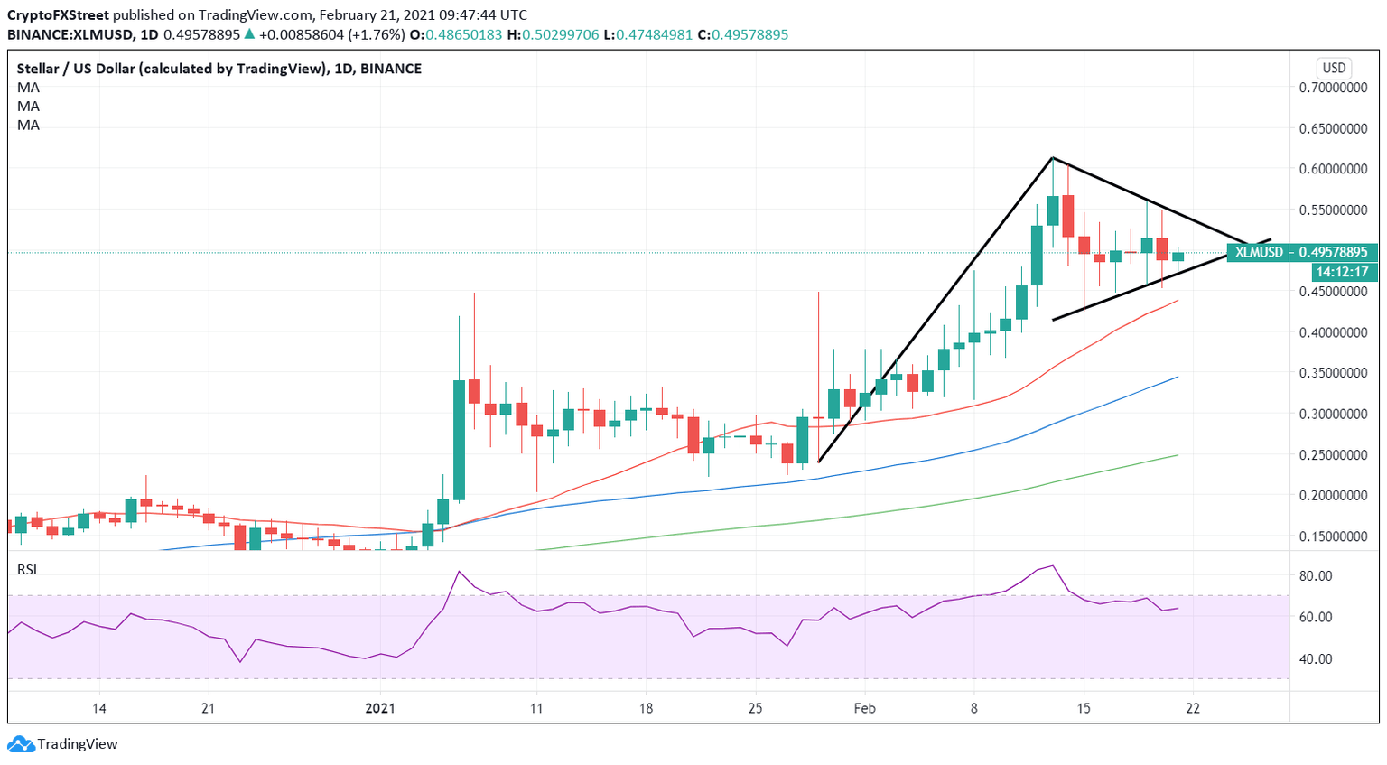 XLM/USD is eyeing a daily closing above the falling trendline resistance at $0.5425 in order to validate a bull pennant formation.