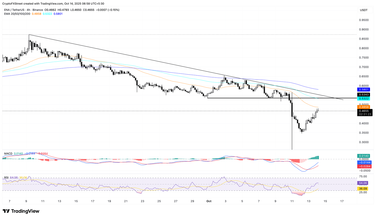 The recovery run on the 4–hour chart approaches the 50-period EMA at $0.4858 as the initial dynamic resistance. If the uptrend crosses above this EMA, the resistance trendline formed by connecting the highs of September 9 and October 2 near the 100-period EMA at $0.5322 would be a critical crossroads.