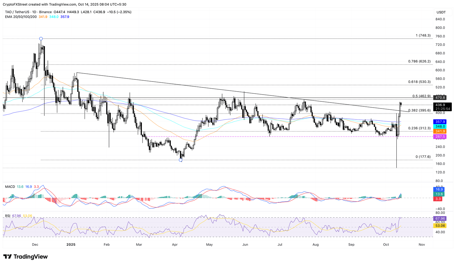 If TAO surfaces above $462 with a decisive close, it could target the 61.8% Fibonacci retracement level at $530.