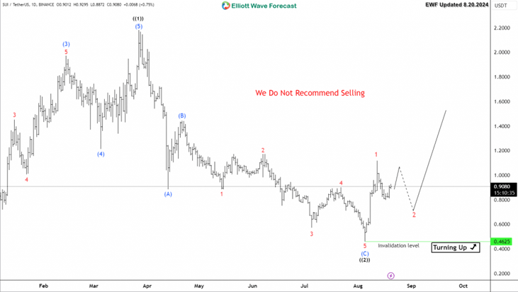 SUI lost 78% of it’s value since March 2024. The coin declined 4 months in a row until it found a bottom on 5Th of August 2024. The move from the peak unfolded within 3 waves and it formed a corrective Elliott Wave structure called ZigZag. This type of correction is followed by a reversal in trend and SUI in this case is proposed to have ended a wave ((2)) pullback therefore it’s expected to resume the rally to the upside within a wave ((3)).