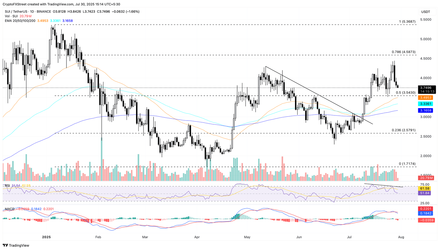 - Sui edges lower for the third consecutive day, getting closer to the key 50-day EMA at $3.49.