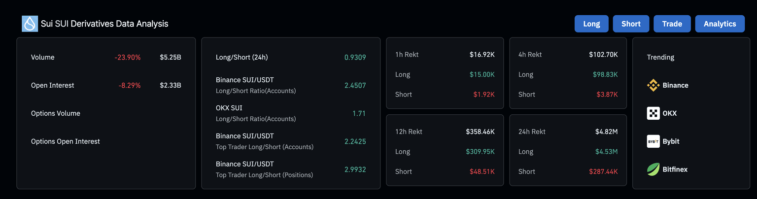 CoinGlass’ data shows the SUI Open Interest at $2.30 billion, down from $2.41 billion on Tuesday. This $110 million capital outflow from the SUI futures and options contracts suggests a decline in traders’ interest in the token.