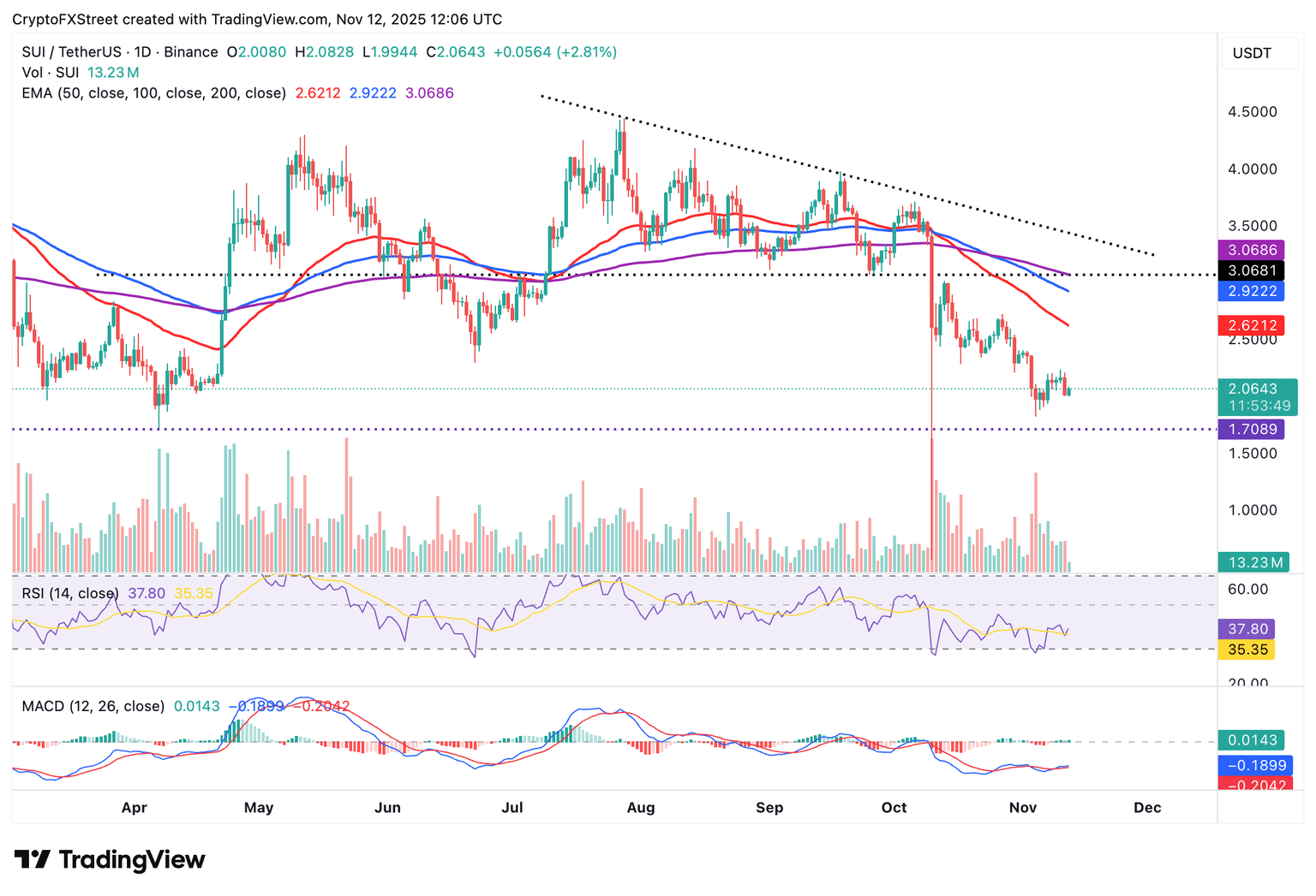 Sui is trading above $2.00 at the time of writing on Wednesday, driven by positive sentiment in the larger crypto market. The Relative Strength Index's (RSI) rebound to 37 from 35 the previous days suggests that bearish momentum is easing.