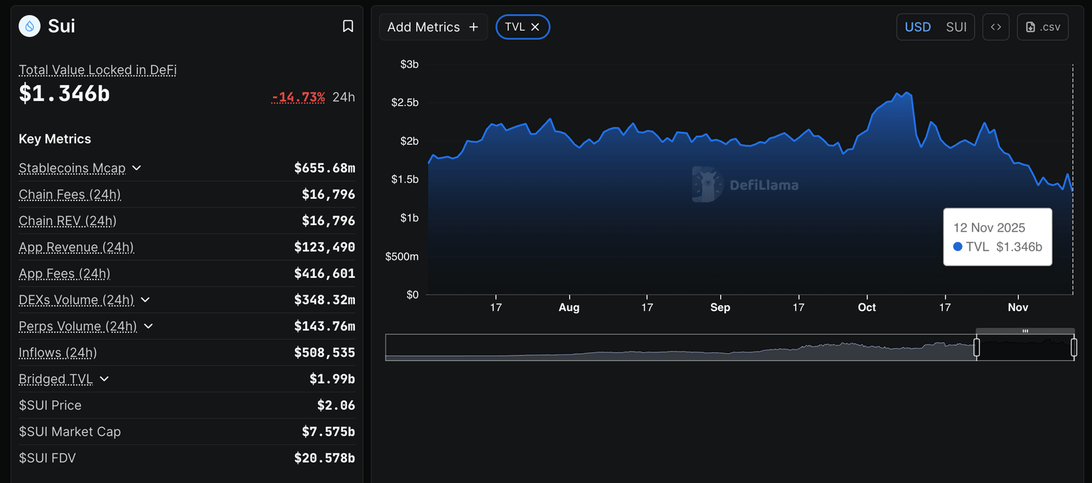 Sui's TVL, which hit a record high of $2.63 billion on October 9, has maintained a downtrend, reflecting the risk-off sentiment in the broader cryptocurrency market.