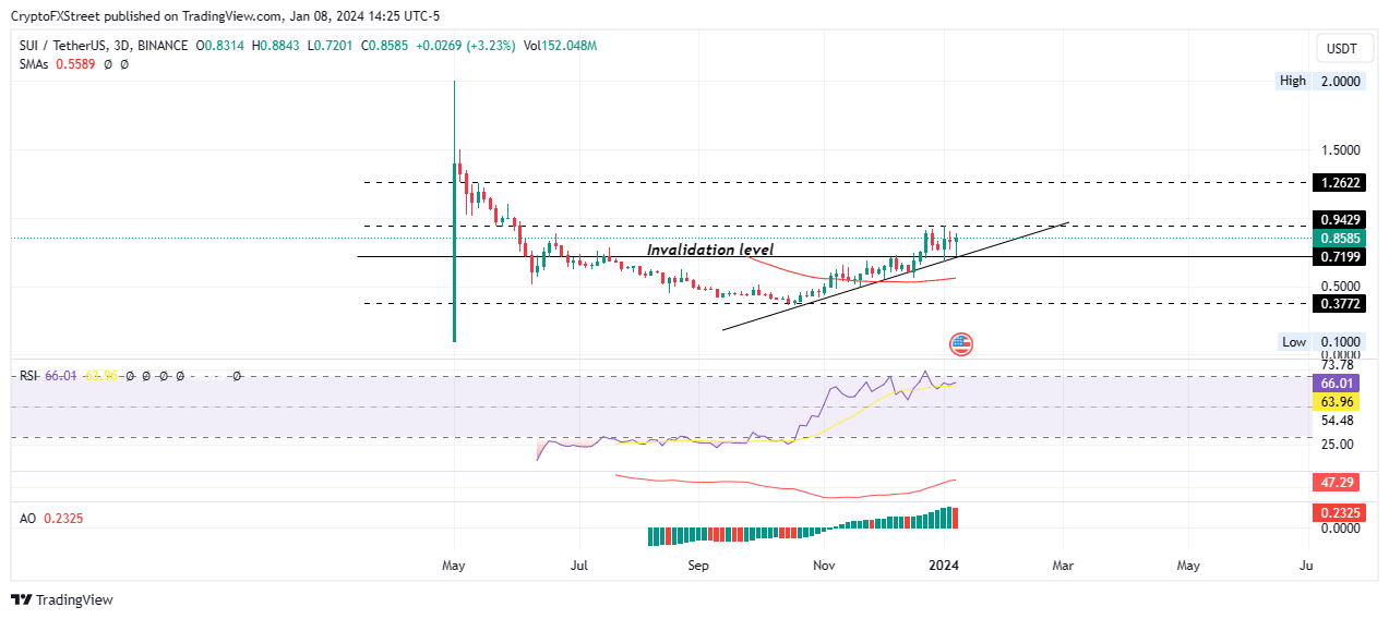 - Sui price remains above the support offered by an ascending trendline that has delivered up to 130% in gains so far.