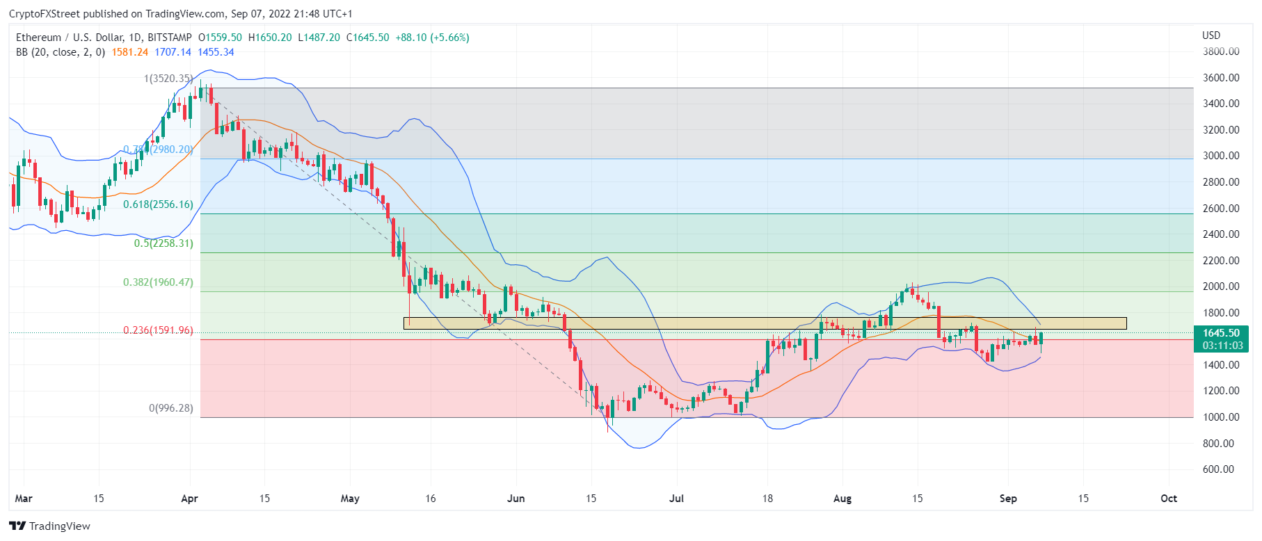 Looking at the current state of the market, it is difficult to say whether or not ETH will manage to reach the expected highs before the Merge arrives. Up by 5% at the time of writing, ETH is trading at $1,637, which is right below the resistance block.