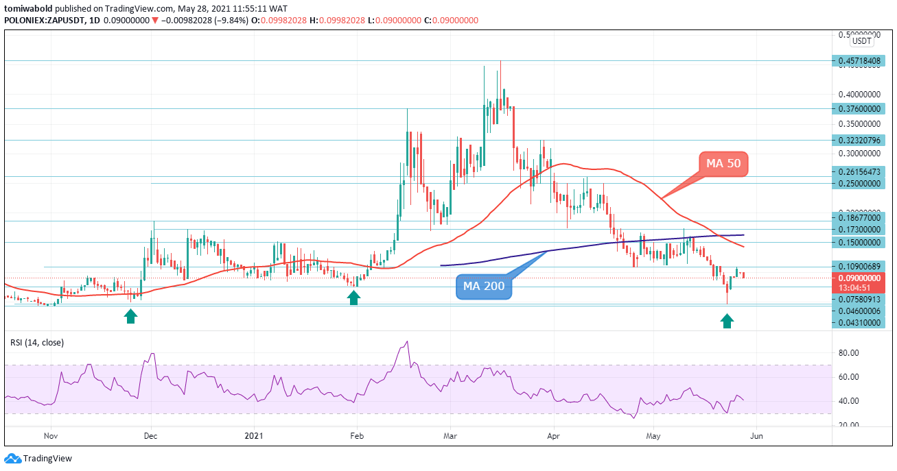 The ZAP/USDT pair may stage a surprising rally after being on the back foot during the cryptocurrency mayhem that lasted for the past few sessions. ZAP rose from lows of $0.0460 to $0.1090, where it's consolidating after probing the topside earlier. At the moment, this sentiment is benefiting the bulls, whose weakening has paused near this year’s lows.