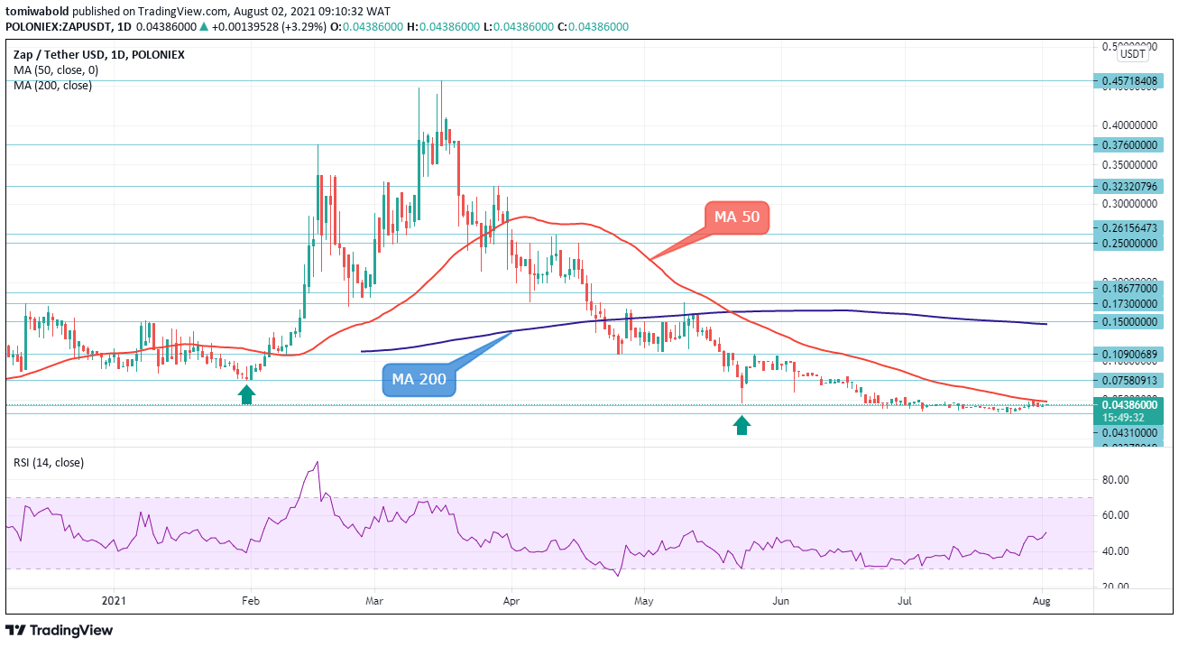 ZAP/USD has so far avoided breaching its bottom line as the stage sets for a strong performance in August. Major technical indicators point to continued strength from recently reached lows of $0.0327. Towards the moving average (MA 50) seen on the daily chart, price pressures are likely to increase in days and weeks, likely leading to an upward shift in bullish expectations to the $0.10 mark.
