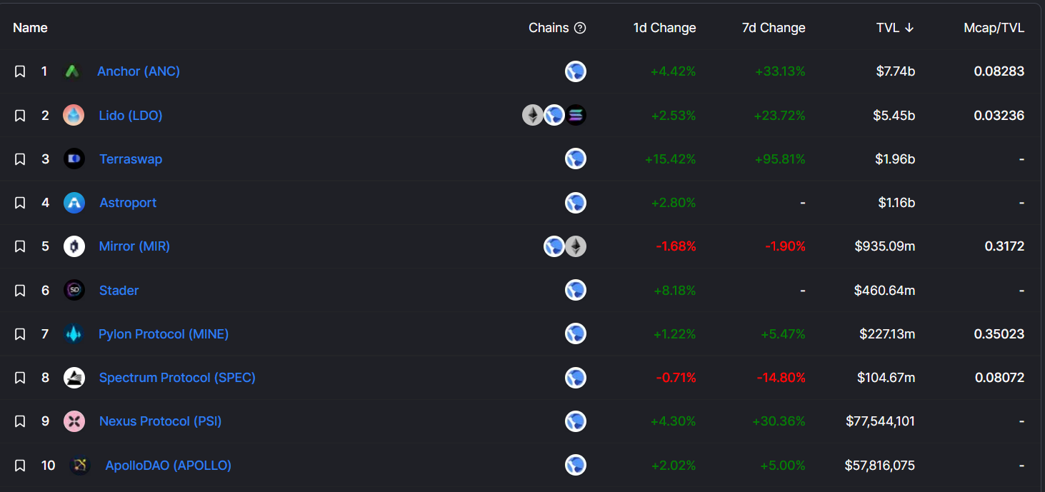 Metaverse and gaming applications have made their mark on Terra as well. The recently launched StarTerra, which calls itself a gamified launchpad that supports NFT integration, locks up $21 million in value, while LoTerra, a decentralized lottery, holds over $311,000 in value.