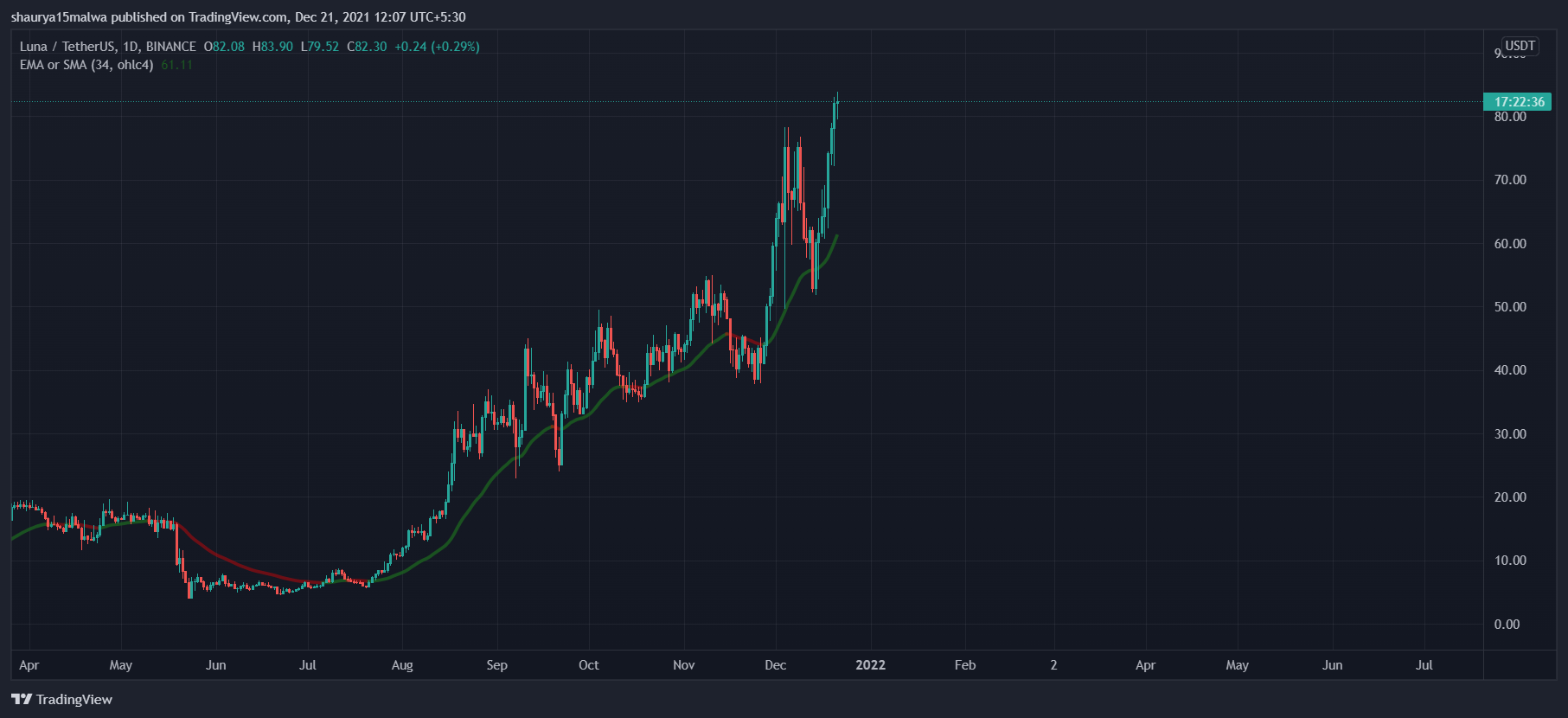 The increase in TVL on Terra coincided with the rising prices of its LUNA tokens. Prices are up 54% compared to the past week, trading at all-time highs of $83 on Tuesday morning, as per data from CoinGecko.