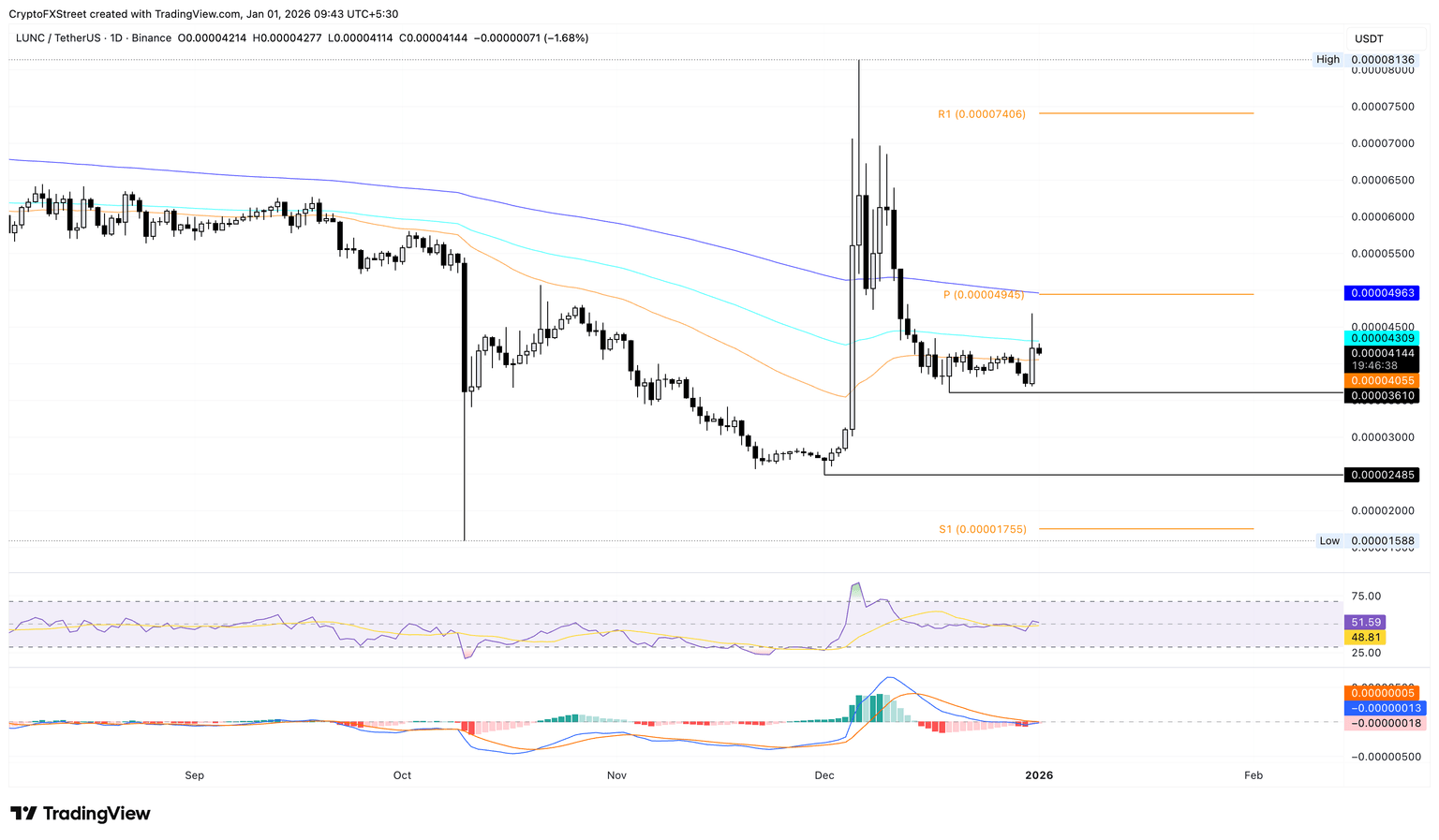 If LUNC exceeds this moving average, it could reach the 200-day EMA at $0.004963 near the R1 Pivot Point at $0.00004945.
