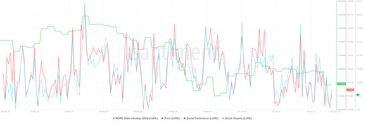 The social volume and social dominance metrics support the bullish outlook for Terra Classic price, showing the share or percentage of LUNC mentions on crypto-related social media is rising, relative to a pool of other popular projects online.