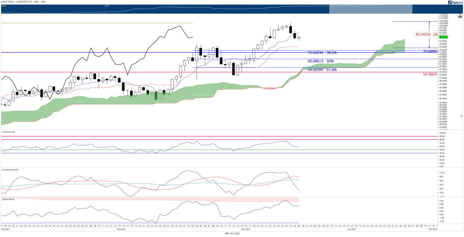 Ideally, a pullback to $75 would occur for long-term bulls while the daily Composite Index prints a low equal to or below the December 13 Composite Index level. That would create hidden bullish divergence while LUNA price is positioned in a supportive and robust confluence zone.