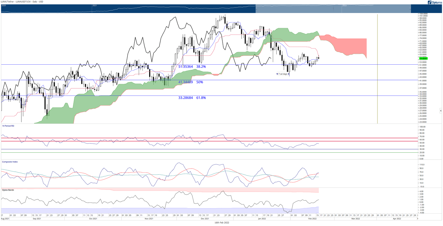 Immediate support for LUNA price is against the Tenkan-Sen at $54, followed by the 38.2% Fibonacci retracement at $51. In particular, the 38.2% Fibonacci retracement should at least give bears some pause. In addition, there is a high volume node in the Volume Profile at $51, and the psychologically important $50 level is in that same value area.
