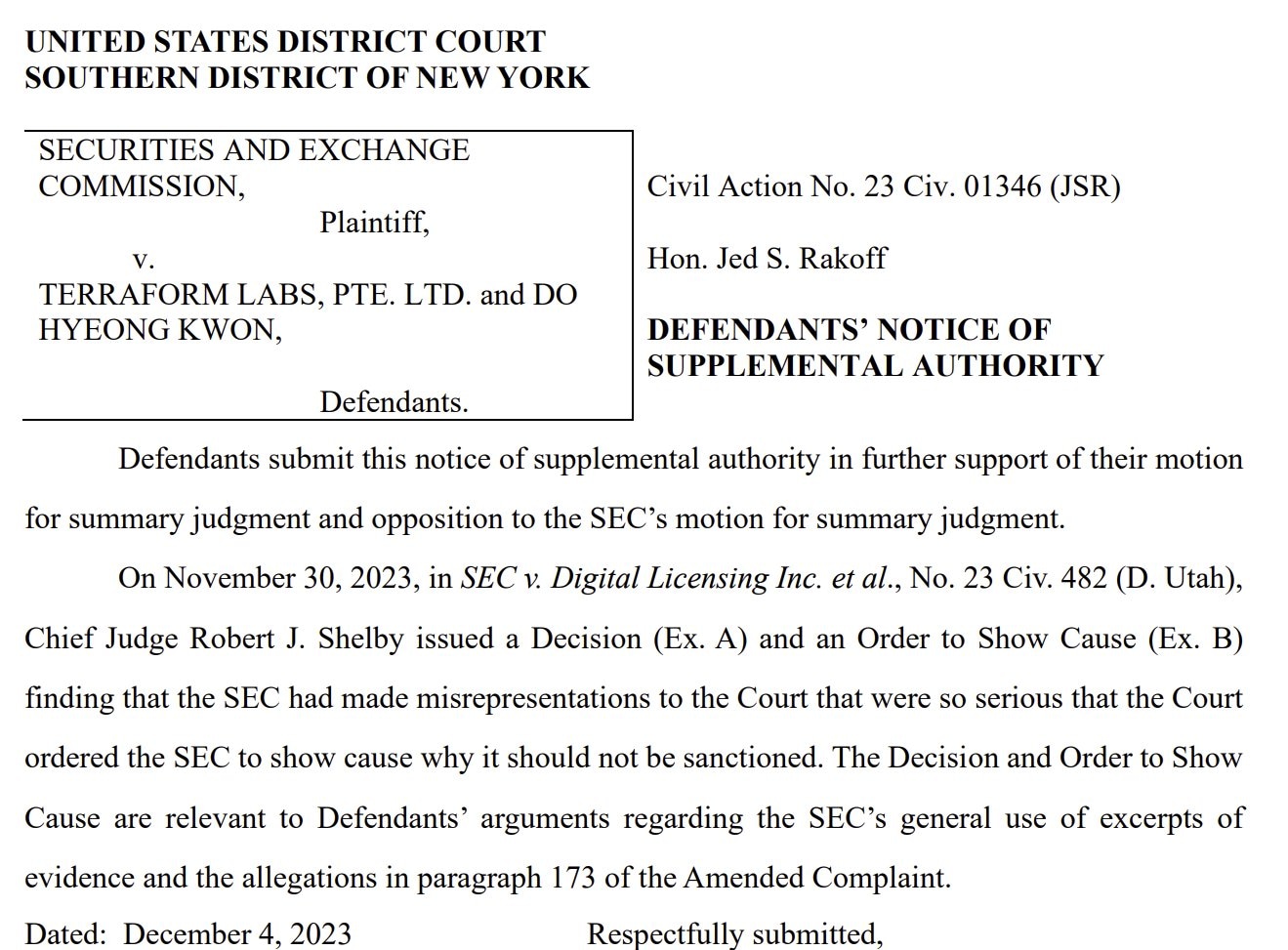 - Terraform Labs points to the SEC for misleading the court in the Debt Box / Digital Licensing case.