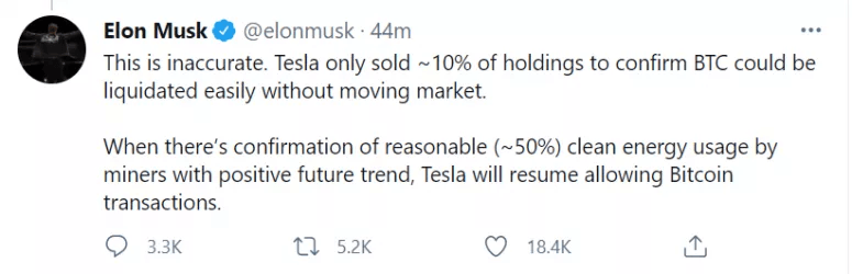 - Musk's tweet also reiterates his defense of having sold 10% of the electric vehicle maker's bitcoin stash in Q1 and would also seem to indicate the company hasn't sold anymore.